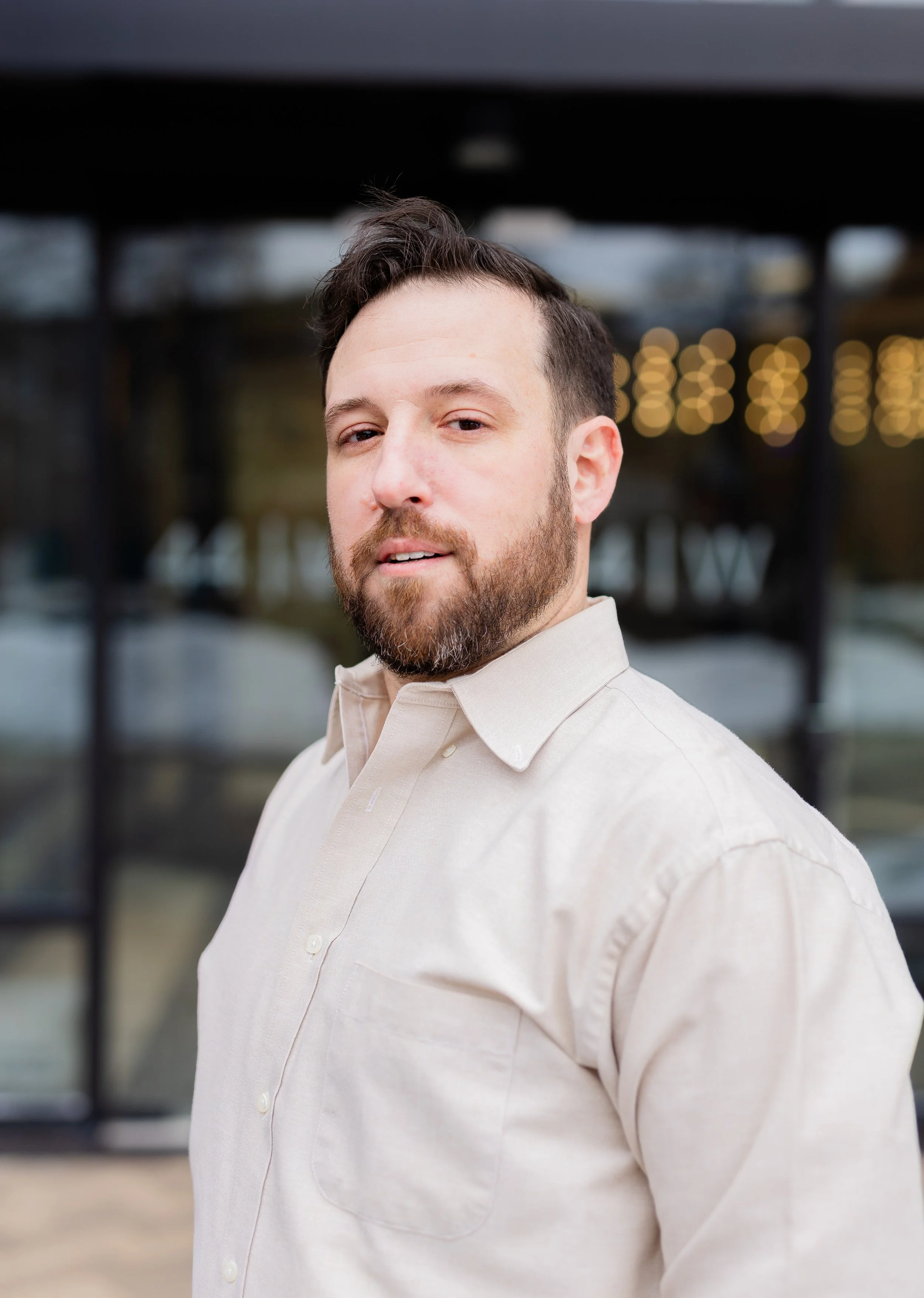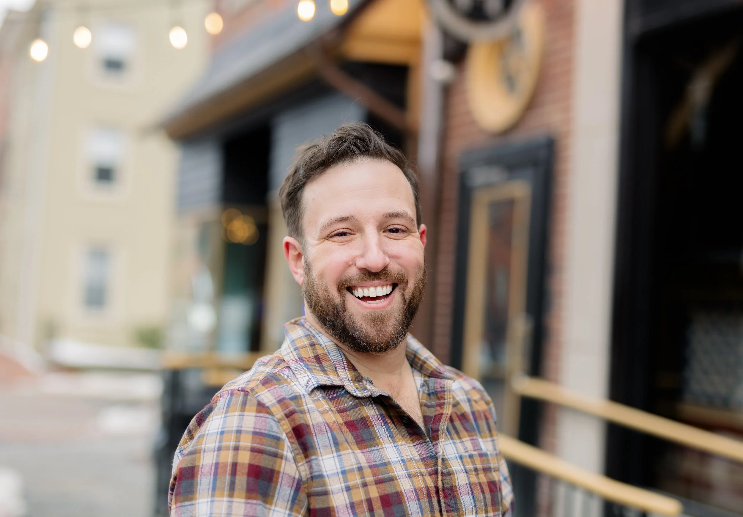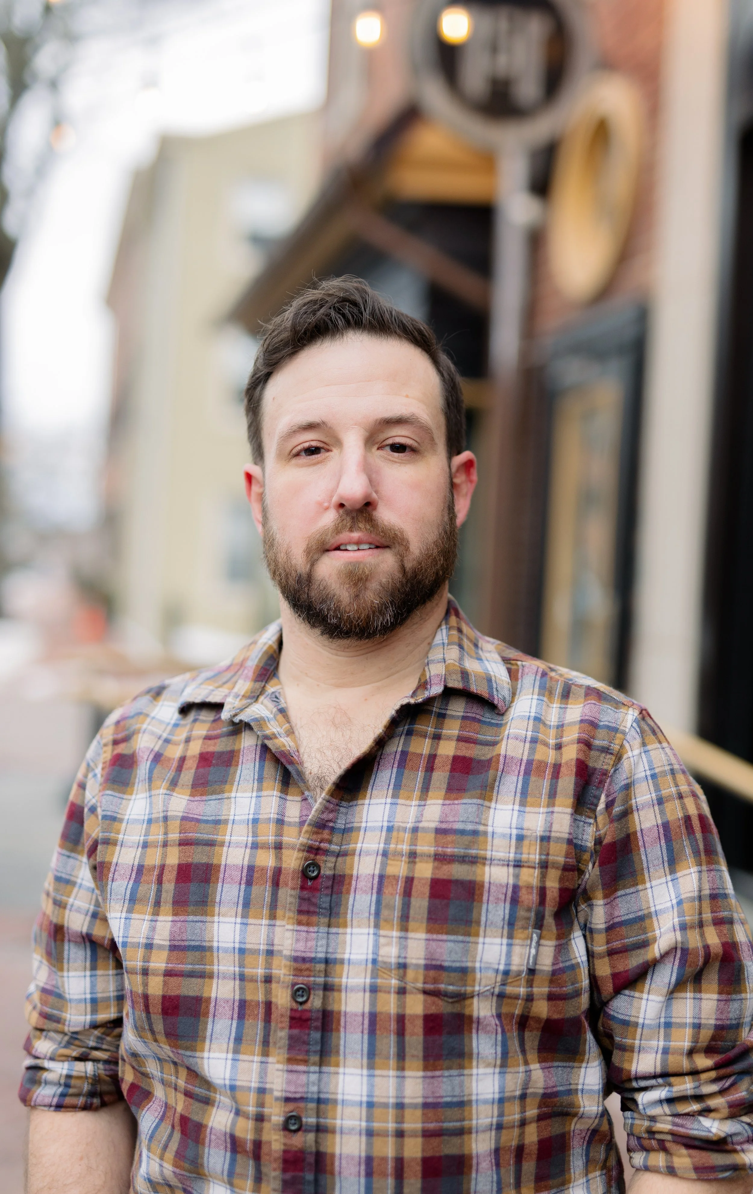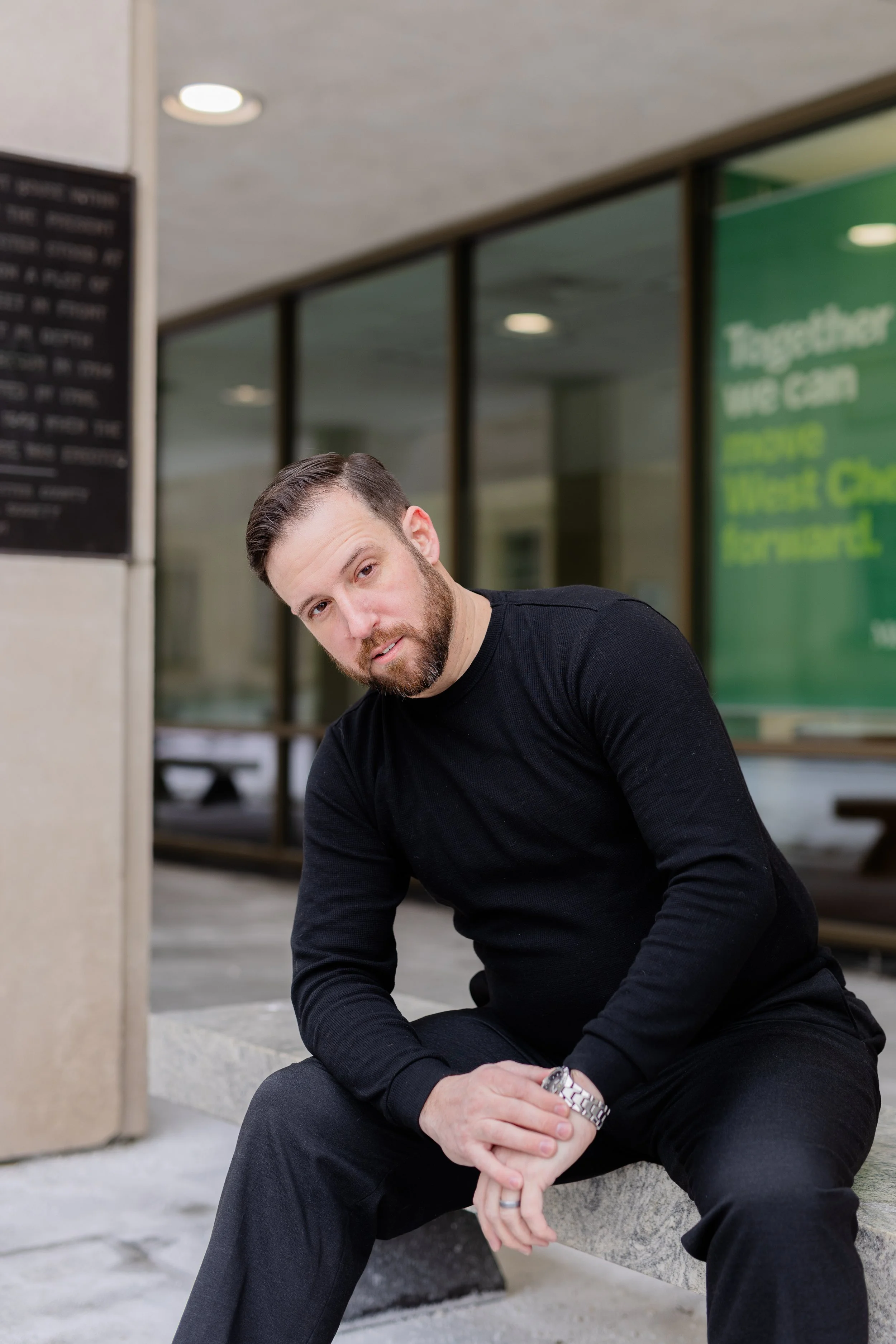 At this point, we’ve been photographing Doug and his family every year, so there’s already that built-in comfort. No awkward warm-up phase, no trying to figure each other out. So when he told me he wanted to put together acting headshots and start going after movie roles and gigs, it felt like a really natural next step—and a fun one to be part of. We met up in downtown West Chester, which ended up being the perfect setting for what he needed. These weren’t meant to be super polished, traditional studio headshots. No plain backdrops or stiff posing. We kept everything natural—using the light as it was, moving through different spots, and letting the environment do some of the work. The goal was simple: make it feel like him.