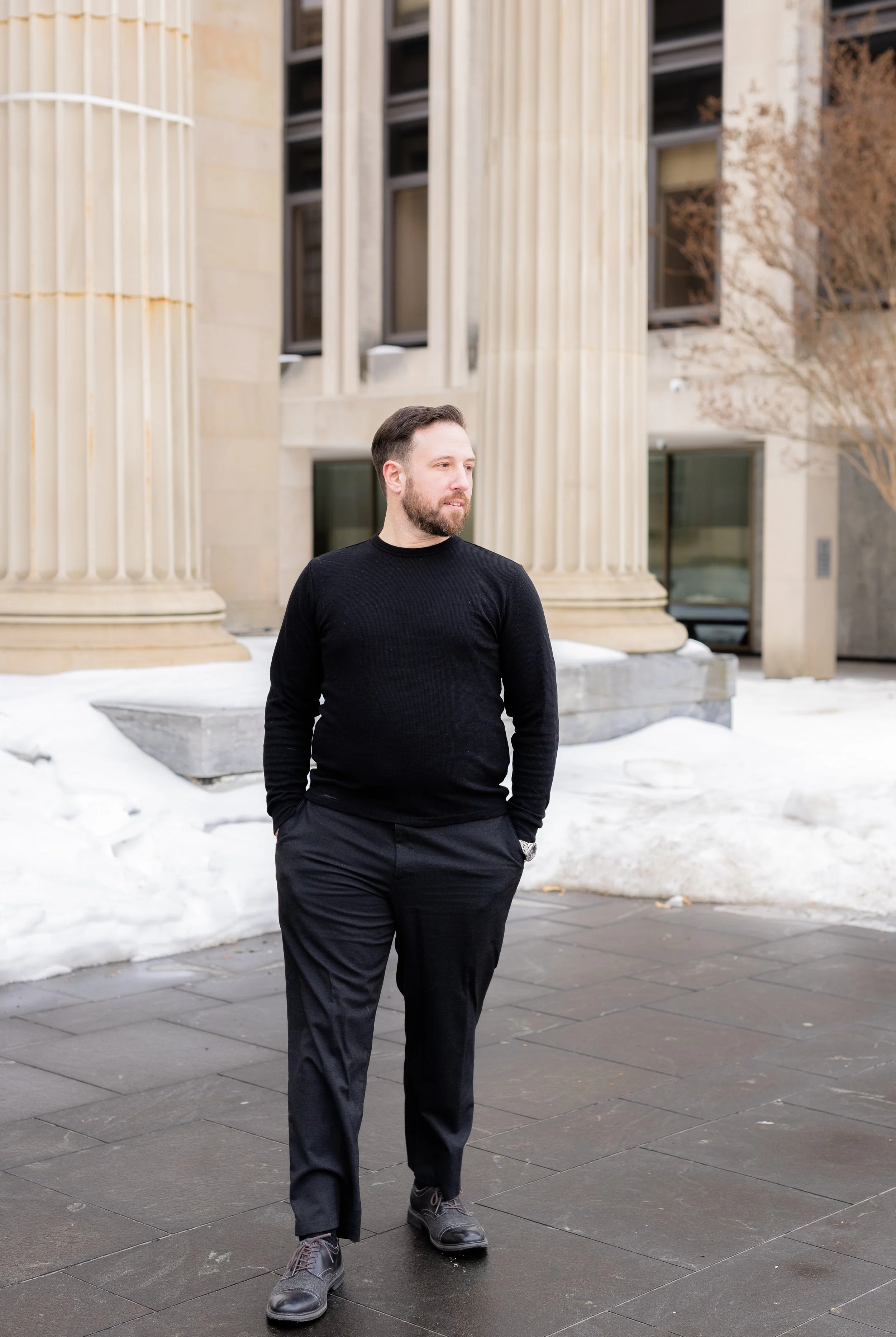 Doug brought three outfits, and each one gave us a different angle. We started with a black monochromatic look—clean, simple, and confident. It really put all the focus on expression, which is exactly what you want for this kind of work. No distractions, just subtle shifts that change the whole feel of an image. Then we moved into a lighter look that felt a bit more open and easygoing. The softer tones worked really well with the light bouncing around town, and these ended up having a really natural, approachable feel to them. We wrapped things up with a more casual, rustic look, which might’ve been my favorite of the three. It felt the most “lived in”—like you could actually place him in a scene. The kind of look that makes you stop and think, “yeah, I know that guy,” which is exactly what casting people are looking for.